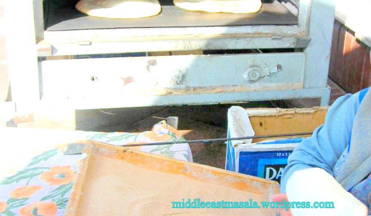 Traditionally Middle Eastern bread is baked in heated brick ovens. The dough is made into a giant loaf and slid into the oven with wooden paddles. In Egypt on the way to Alexandria from Cairo we stopped at a restaurant outside which a lady was busy baking tasty bread.