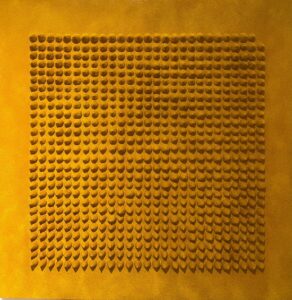 Sifr or zero by Indian artist Gunjan Kumar shows the theme of infinite possibilities through the medium of handmade turmeric cones. The Indian artist made numerous handmade cones, by rotating matter like a whirling dervish.