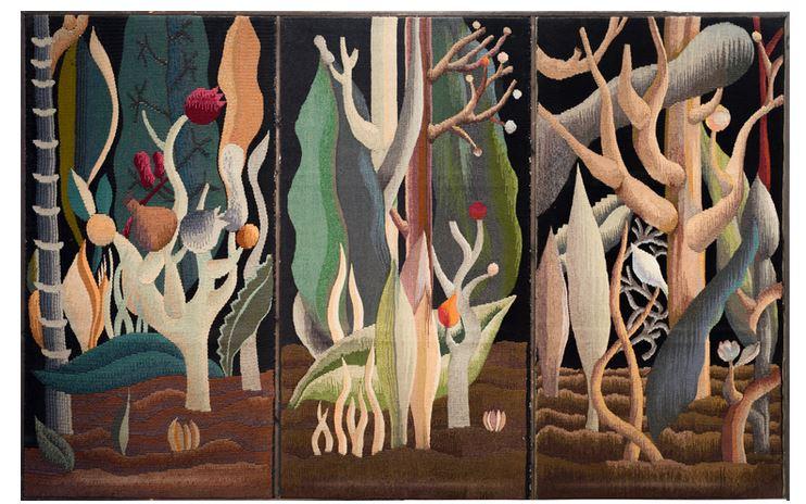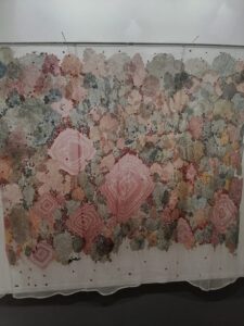 Indian artist Varunika Saraf’s Land That Bleeds Watercolour on Lotka paper pasted on cotton textile, tackles rise in violence in contemporary world through the medium of wasli, a Mughal technique of binding together layers of paper.