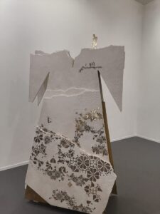 A marble thoub by Naqsh Collective decorated with brass adornments pays tribute to the Palestinian cross stitch embroidery. The collective is run by Nisreen Abudail, an architect based in a Jordan and her sister Nermeen Abudail, a graphic designer based in Dubai.